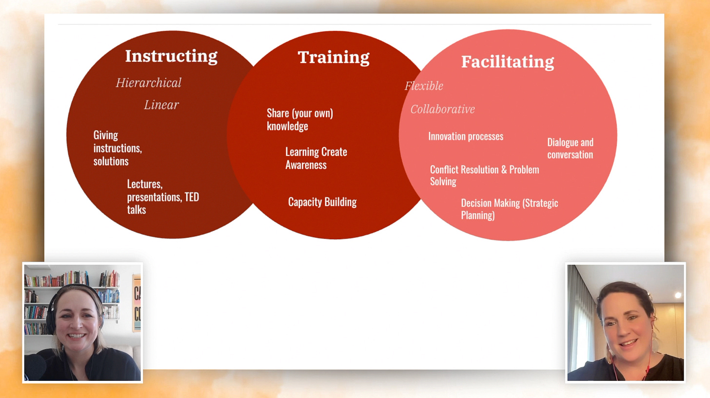 Very relevant to this topic is the latest in the Edges of Facilitation series: Facilitation vs Training (vs Instructing!) with Florentine (Flor) Versteeg.